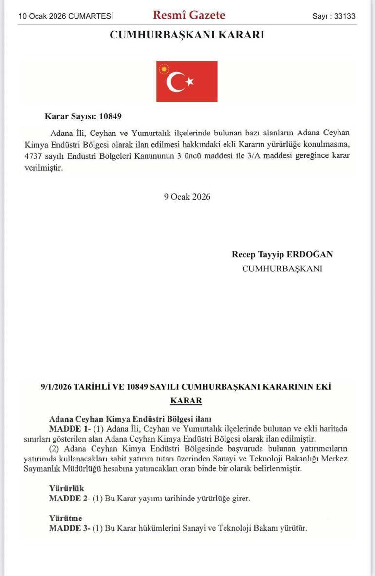Bakan Kacır, sosyal medya hesabı üzerinden yaptığı paylaşımda, Türk sanayiini geleceğe taşıyacak adımların atılmaya devam ettiğini belirterek, “29,3 milyon metrekare büyüklüğünde “Adana Ceyhan Kimya Endüstri Bölgesi” Cumhurbaşkanımız Sayın Recep Tayyip Erdoğan tarafından imzalanan kararla ilan edildi.
