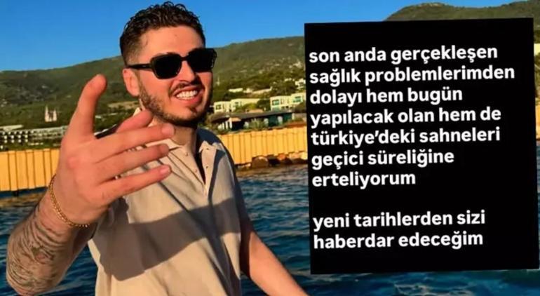 Ünlü rapçi, sevenlerini endişelendiren mesajında; ''Son anda gerçekleşen sağlık problemlerimden dolayı hem bugün yapılacak olan hem de Türkiye'deki sahneleri geçici süreliğine erteliyorum. Yeni tarihlerden sizi haberdar edeceğim'' ifadelerini kullanmıştı.