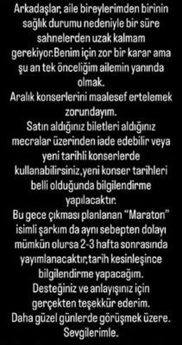 'Arkadaşlar aile bireylerimden birinin sağlık durumu nedeniyle bir süre sahnelerden uzak kalmam gerekiyor. Benim için zor bir karar ama şu an tek önceliğim ailemin yanında olmak. Aralık konserlerini maalesef ertelemek zorundayım. Satın aldığınız biletleri aldığınız mecralar üzerinden iade edebilir veya yeni tarihli konserlerde kullanabilirsiniz'