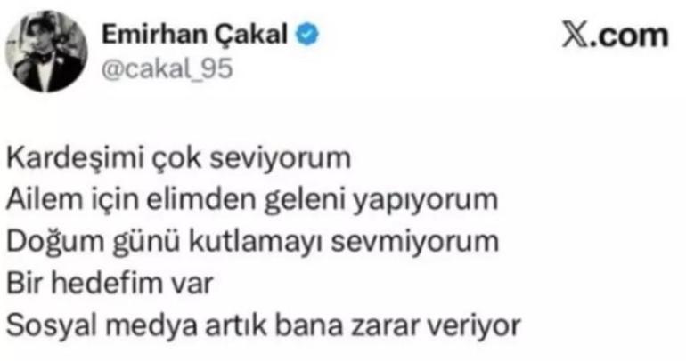 Emirhan Çakal ise 5 Aralık tarihinde sosyal medya hesabında yaptığı paylaşımda, "Kardeşimi çok seviyorum. Ailem için elimden geleni yapıyorum. Doğum günü kutlamayı sevmiyorum. Bir hedefim var. Sosyal medya artık bana zarar veriyor" demişti.