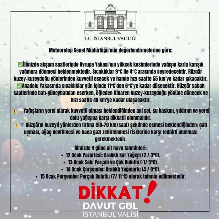 İstanbul Valiliği'nden beklenen kar yağışı ile ilgili yeni açıklama yapıldı. Valilikten yapılan açıklamada şu ifadelere yer verildi; Meteoroloji Genel Müdürlüğü'nün değerlendirmelerine göre;