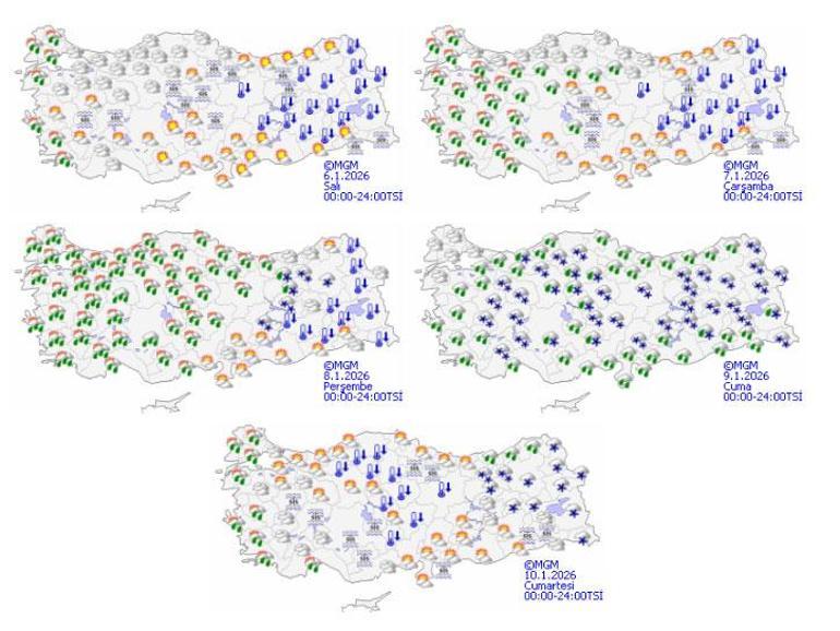 Meteoroloji Genel Müdürlüğü tarafından yapılan tahminlere göre: Ülkemiz genelinin parçalı ve çok bulutlu, Kıyı Ege ile Balıkesir'in batı ilçeleri, Çanakkale, Tekirdağ, Edirne ve Kırklareli çevrelerinin yağmur ve sağanak yağışlı geçeceği tahmin ediliyor. Rüzgarın; Marmara’nın batısı ve Kıyı Ege’de güney ve güneybatı yönlerden kuvvetli (40-60 km/saat); Hatay'ın güneyinde, kuzey ve doğu yönlerden kuvvetli ve kısa süreli fırtına (40-70 km/saat) şeklinde esmesi bekleniyor. Sabah ve gece saatlerinde iç ve doğu bölgelerde buzlanma ve don ile birlikte pus ve yer yer sis olayı bekleniyor. Doğu Karadeniz’in iç kesimlerinin yüksekleri ile Doğu Anadolu’nun doğusunda yüksek kar örtüsüne sahip eğimli kesimlerinde çığ tehlikesi bulunmaktadır.