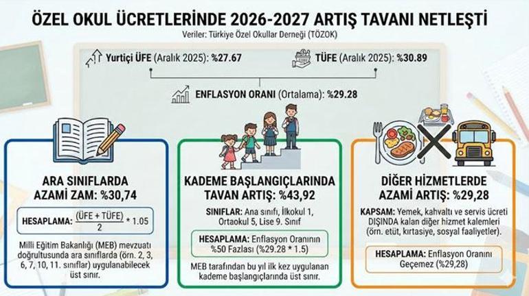 Özel okullarda yemek, kahvaltı ve servis ücreti dışında kalan diğer hizmet kalemleri (kıyafet, kitap, kırtasiye, sosyal hizmetler) gibi ücretlere de ÜFE ve TÜFE toplamının ikiye bölünmesi formülüne göre en fazla yüzde 29.28 zam yapılabilecek.